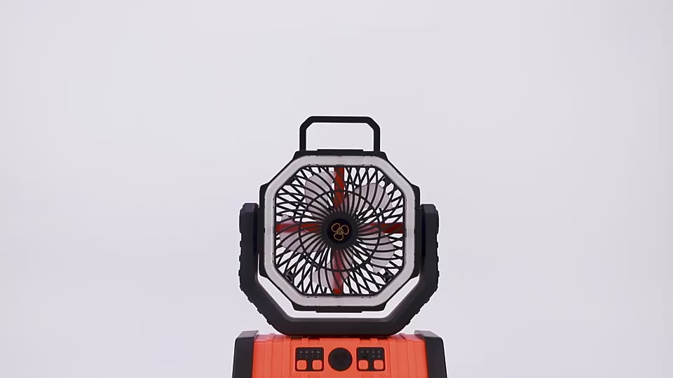 ๐๐๐ฆ๐จ๐ญ๐ ๐๐จ๐ง๐ญ๐ซ๐จ๐ฅ & ๐๐ฎ๐ญ๐ญ๐จ๐ง ๐๐ฉ๐๐ซ๐๐ญ๐ข๐จ๐งย - This rechargeable fan has 2 operated options remote control and press the base button. Flexibly use the remote control to adjust the camping fan speeds, lighting and timing within 26 ft distance. Open the hook of the base to hang on the tent, you take the remote control to point it at the outdoor camping fan can rotate 360ยฐ, very comfortable to enjoy! (Note: Remove the insulating plate in the slot on the back of the remote.)
